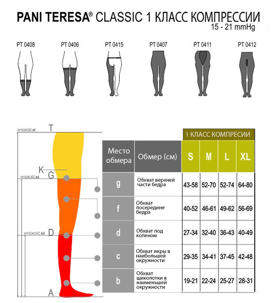 Антиварикозные колготы 1-го класса компрессии 15 - 21 мм рт. ст. PANI TERESA® - это медицинский продукт, который предназначен для профилактики и лечения венозной недостаточности, снимает синдром "тяжелых ног" и их отек. Компрессионные колготы 1-го класса рекомендуется использовать еще на ранней стадии заболевания вен, особенно людям которые долгое время находятся на ногах. Благодаря регулярному использованию компрессионных колготок 1-го класса компрессии, на ногах уменьшается видимость симптомов венозной недостаточности. Поскольку лечебный эффект зависит от правильно выбранного вами размера, то следует обязательно сделать правильные замеры ноги для определения размера. Замеры необходимо делать еще утром, когда ноги после ночного отдыха еще не набухли, померить следует две ноги на указанных в таблице местах.