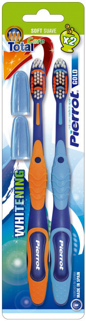 Специальное предложение для семьи: 2 щетки в 1 упаковке. Высокотехнологичная зубная щетка Pierrot Gold (мягкая), щетинки гибкие и выступают на кончике щетки. Бережно удаляют зубной налет, полируют эмаль.
