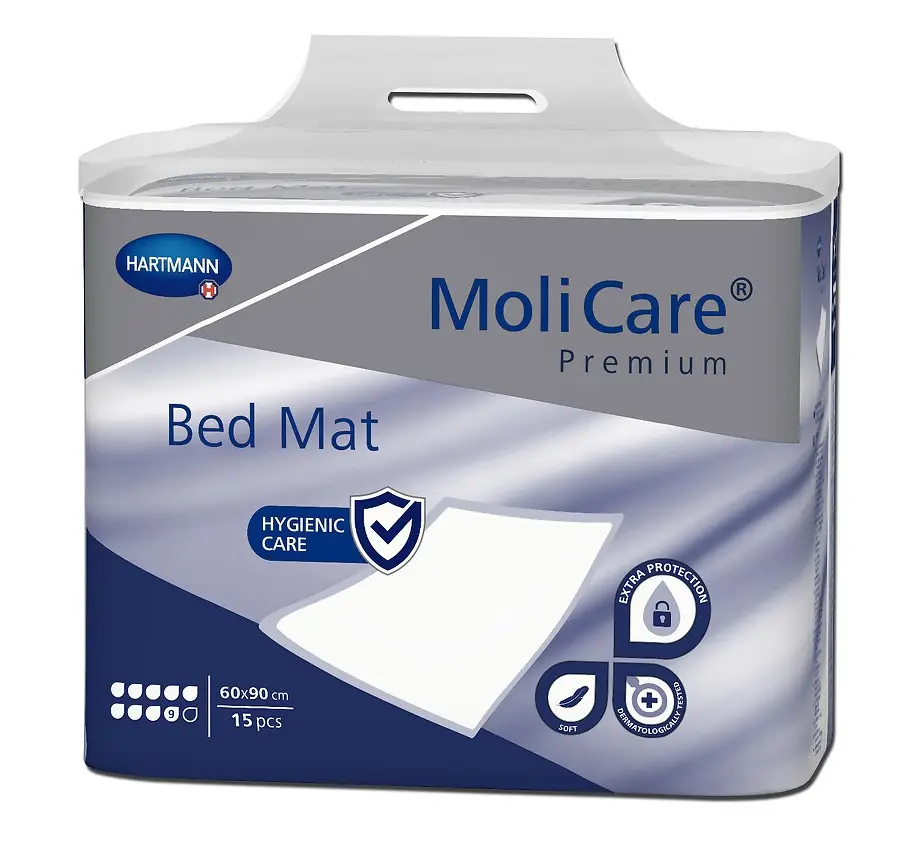 MoliCare® Premium Bed Mat 9 капель - одноразовые пеленки с суперпоглощающей сердцевиной из разрыхленной целлюлозы и суперабсорбента, что обеспечивает гигиенический уход и дополнительную защиту.