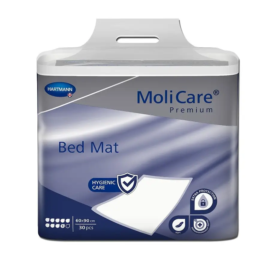 MoliCare® Premium Bed Mat 9 капель - одноразовые пеленки с суперпоглощающей сердцевиной с разрыхленной целлюлозой и суперабсорбентом, что обеспечивает гигиенический уход и дополнительную защиту.