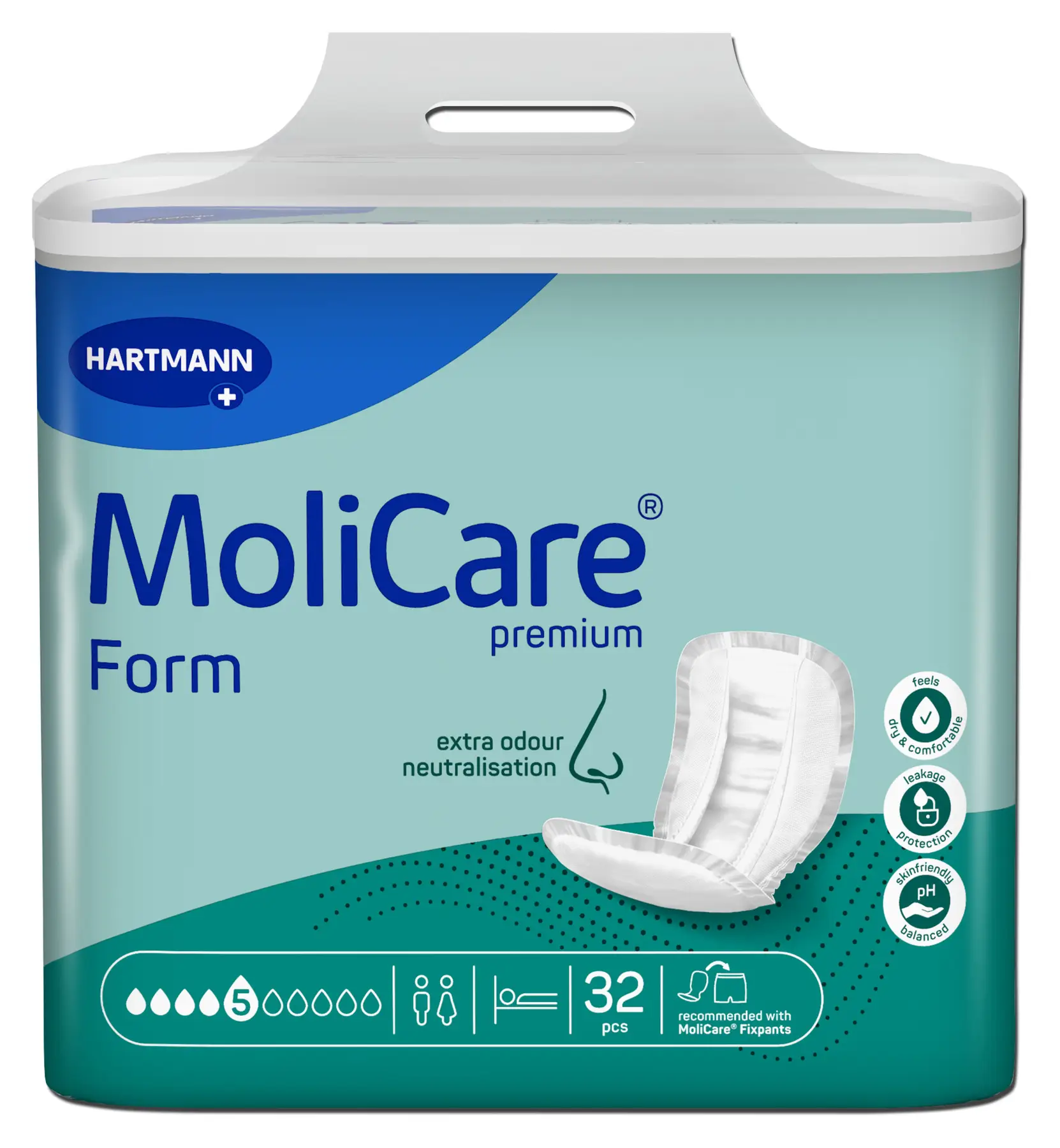 - Прокладки анатомической формы при недержании MoliCare® Premium Form рекомендуется совмещать с многоразовыми эластичными штанишками для фиксации прокладок MoliCare Premium Fixpants.