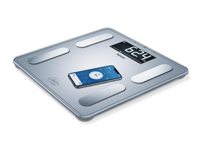 Весы для диагностики всего тела с подключением к смартфону. Определяют массу тела, процент мышц, жира, воды, костной массы, скорость обмена веществ и индекс массы тела с интерпретацией измеренных значений. Показатели и динамика изменений отображаются в бесплатном мобильном приложении.