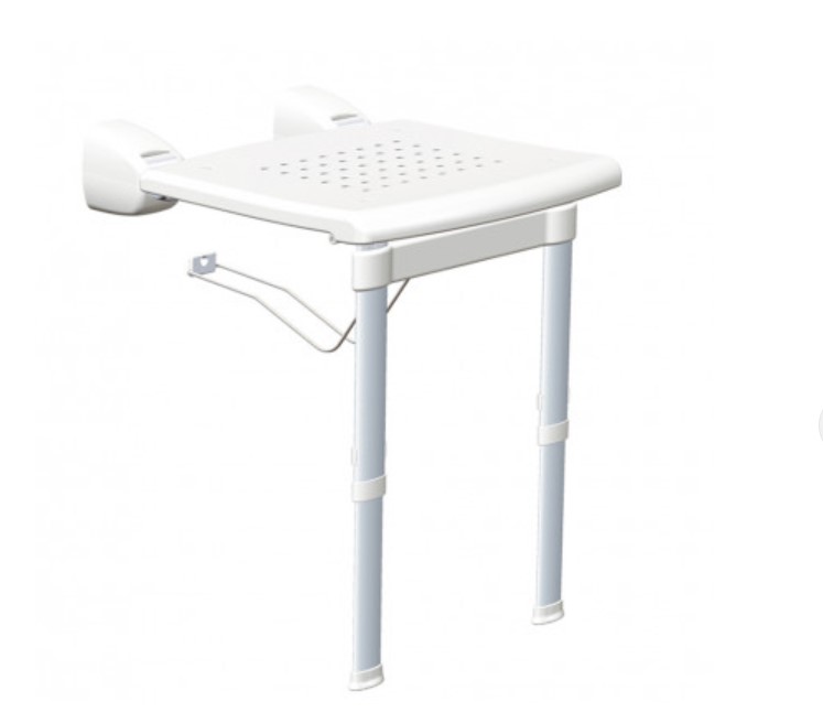 - Практическое настенное сиденье для душевой с ножками и дренажными отверстиями.