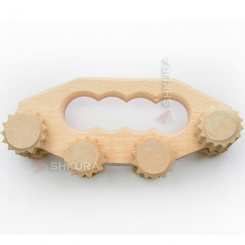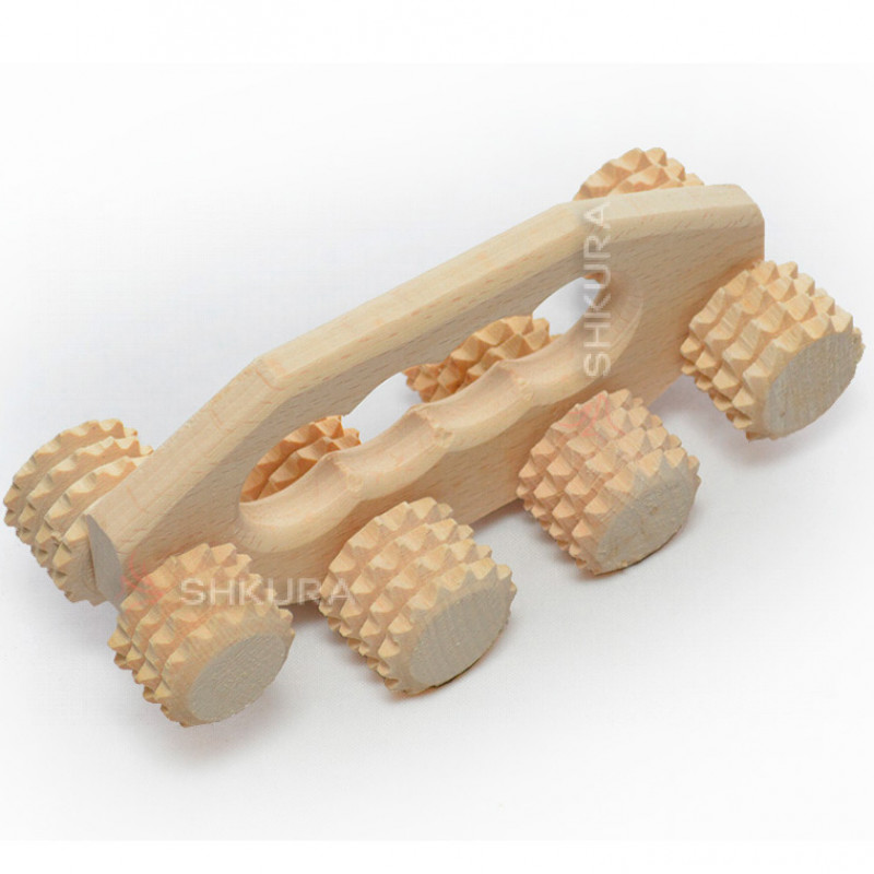 Роликовий ручний масажер для виготовлений з натурального бука, міцний, комфортний для масажу та естетично привабливий. Має 8 дерев'яних роликів для самостійного масажу у домашніх умовах.