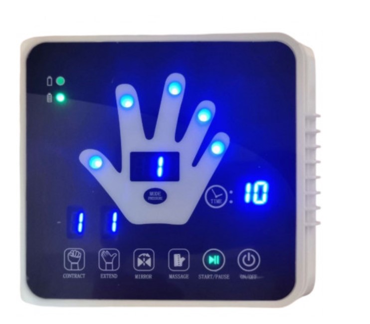 - LED-дисплей відображає: індикатор заряду акумулятора, швидкість стиснення/розтискання пальців, функцію «дзеркального керування», старт/пауза, увімкнення/вимкнення, режим процедури, час процедури, а також індикатори увімкнення та вимкнення кожного пальця окремо.