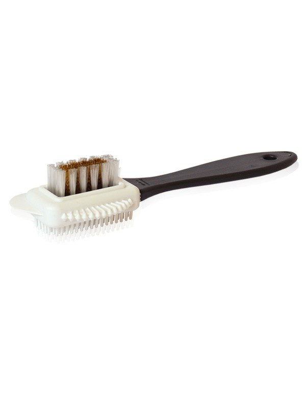 Двостороння щітка для чищення замші та шкіри з нубуку. З одного боку, вона має гумові щетинки для чищення нубука, а з іншого боку латуні - для чищення замші. Профільована ручка кисті зроблена із пластику.