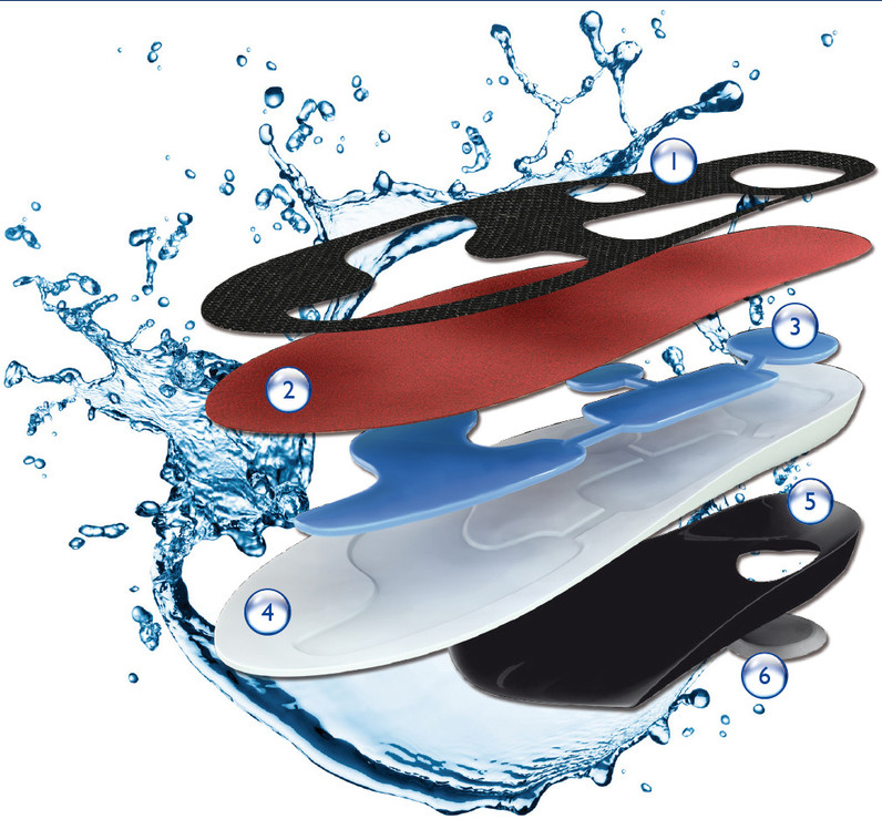 - Гелеві елементи: забезпечують підтримку поздовжнього та поперечного склепінь. Мають гідростатичну функцію і таким чином забезпечують правильний розподіл тиску на стопу.