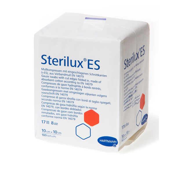 Марлеві серветки Sterilux ES із підвернутими обрізними кромками з абсорбуючої бавовняної тканини відповідно до стандартів EN 14079. Використовуються для універсального догляду за ранами - особливо для першої обробки забруднених, інфікованих і сильно ексудуючих ран у вигляді тампона. Також вони використовуються для невеликих хірургічних процедур в амбулаторних умовах та в лікарні.