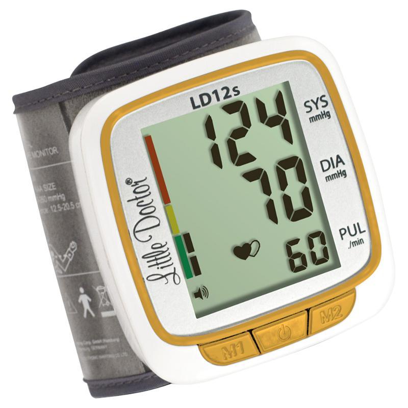 Автоматичний тонометр, що говорить, на зап'ястя Little Doctor LD-12s з класифікацією результатів вимірювань за шкалою ВООЗ. Тонометр має регулювання гучності голосового відтворення, можливість вибору мови відтворення (російська, англійська, французька, іспанська, німецька). Алгоритм Fuzzy враховує індивідуальні особливості серцебиття. Тонометр має індикацію аритмії, великий дисплей з індикацією тиску, пульсу, дати та часу вимірювання. 2 блоки пам'яті зберігають до 90 останніх вимірювань з функцією обчислення середнього значення 3 останніх вимірювань. Манжета збільшеного розміру для кола зап'ястя 12.5-20.5 див.