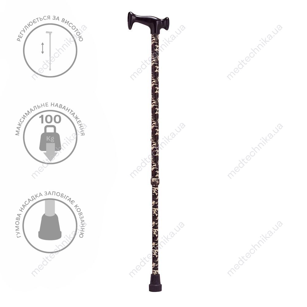 Тростина Ridni Опора KJT919C для пересування літніх людей, після хвороб та травм, при порушенні функцій опорно-рухового апарату. Складається з опорної ручки та стійки, всередину якої входить подовжувач для регулювання висоти ручки. Висота регулюється за допомогою фіксатора та стопорної гайки. Має гумовий наконечник, що забезпечує надійний захист проти ковзання.