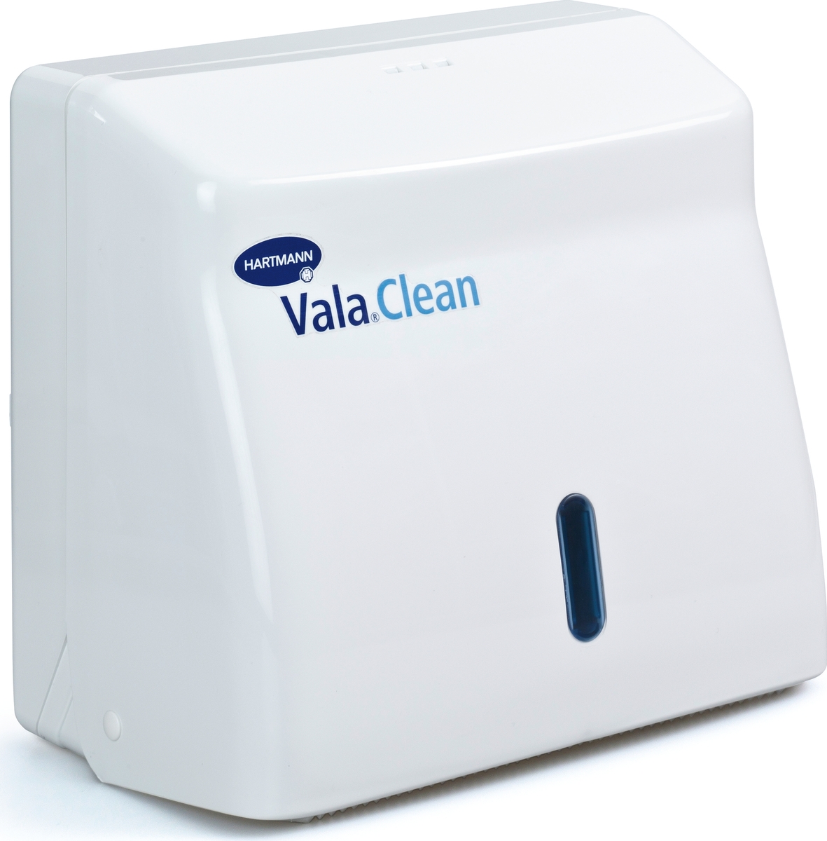 Диспенсер для одноразових рушників і складеного паперу Vala®Clean box, виготовлений з міцного білого твердого пластику, монтується на стіну. З прозорим отвором для контролю за наповненням. Замикається.