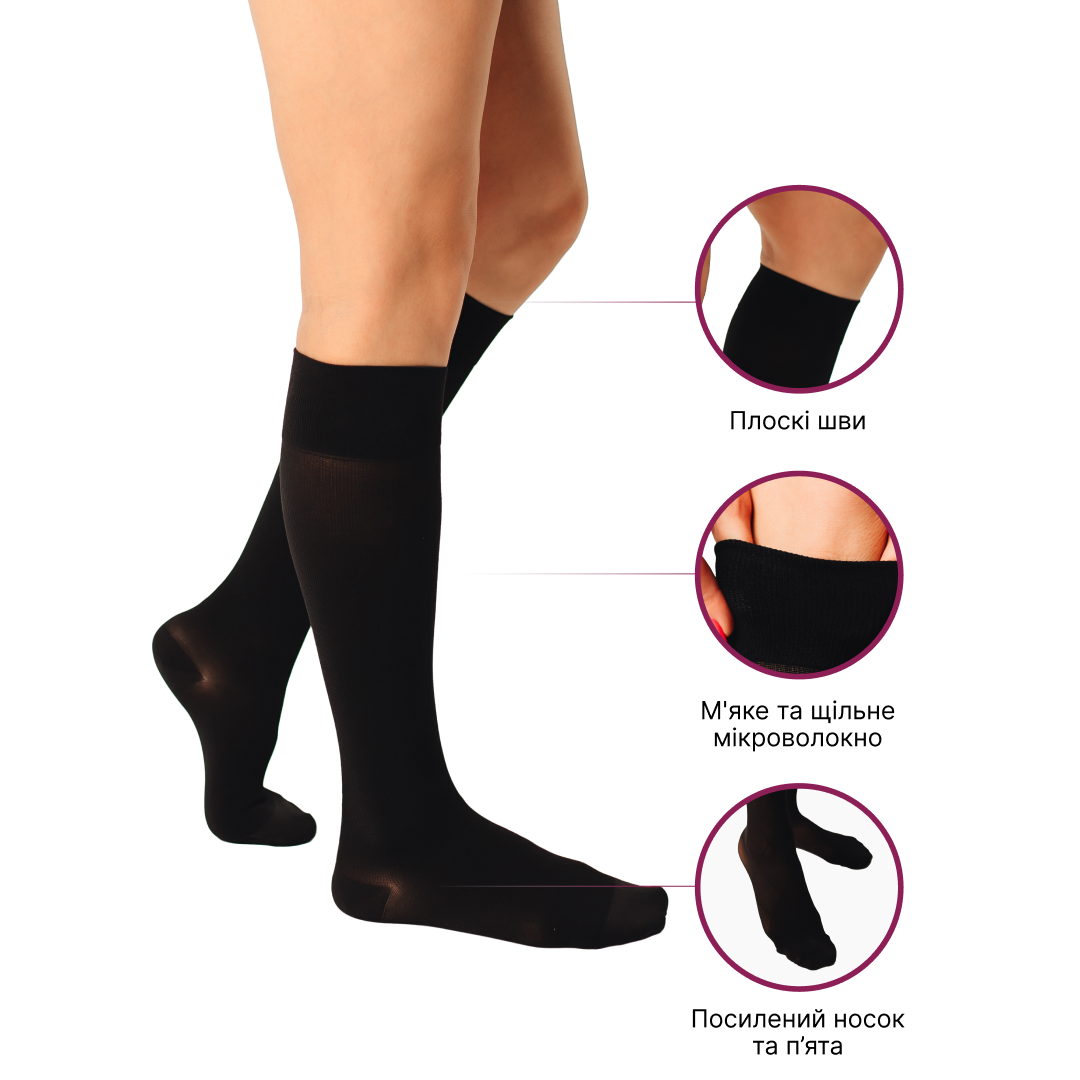 Носіння компресійних гольфів Microtrans (мікрофібра) 2 клас компресії полегшує болючі відчуття, сприяє зняттю набряків, запобігає глибокому тромбозу вен та іншим серйозним розладам. Комфортні, м'які та легкі медичні компресійні гольфи чудово підходять для чоловіків та жінок.