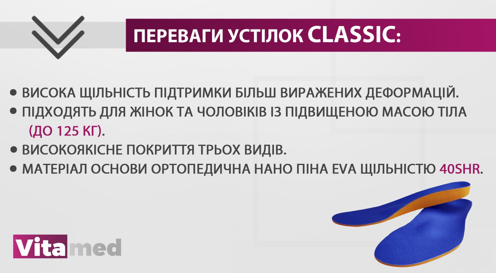 сучасних і ефективних матеріалів. Устілки vitamed забезпечать вам комфорт і додадуть впевненості кожному кроку.