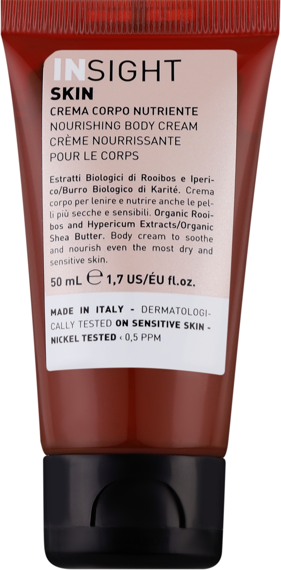 Skin Nourishing Body Cream – живильний крем для тіла, розроблений фахівцями відомого італійського бренду Insight для всіх типів шкіри, зокрема чутливої. Майстри збагатили склад продукту органічними екстрактами та цінною олією ши. Це робить консистенцію засобу напрочуд приємною і легкою, що чудово розподіляється і вбирається, відмінно зволожує шкірний покрив. Надовго утримуючи цілющу вологу в глибоких шарах епідермісу, крем швидко справляється з лущенням, сухістю, стягнутістю. При цьому продукт дуже економічно витрачається, тим самим допомагаючи замінити цілий домашній арсенал бьюті-продуктів.